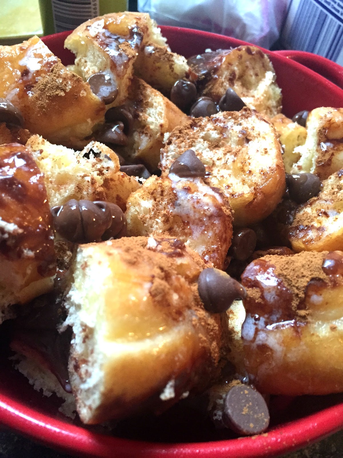 - Preheat the oven to 350 degrees. Take the donuts that have been cut into chunks and spread out in an 8 inch baking pan. Drizzle the melted butter over the donuts. Sprinkle the cinnamon and the chocolate chips over the donuts.