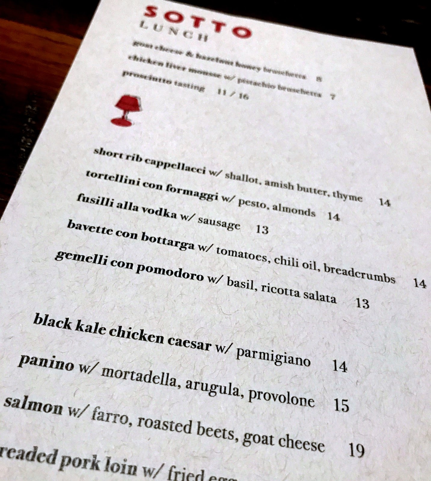They’re right next to Boca – another place I’m dying to go – but Boca isn’t open for lunch. Booo! Sotto is down a precarious staircase and, once inside, a dark little cozy place! Exposed brick and the smell of delicious Italian food – I’m ready!