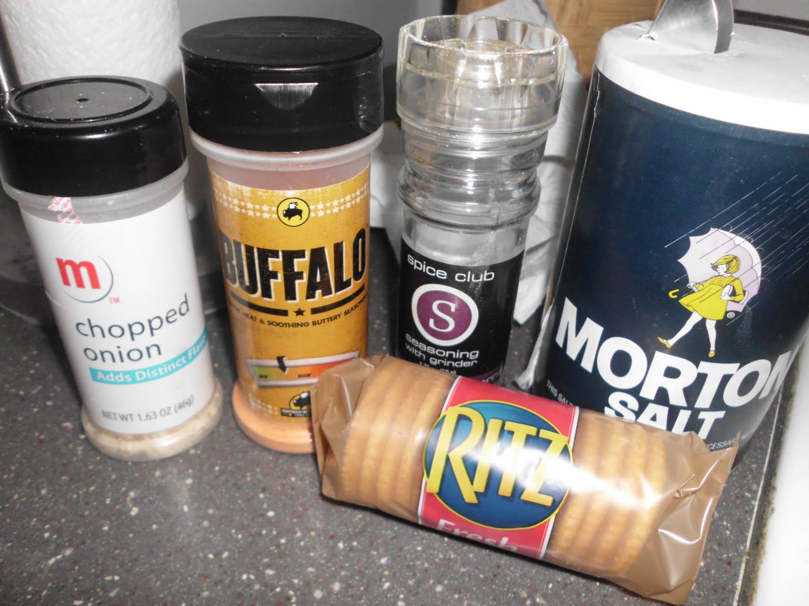 Heat oven to 350° F. In a bowl, combine the crackers, cheese, garlic, ¼ teaspoon each salt and pepper, Buffalo seasoning and onion.