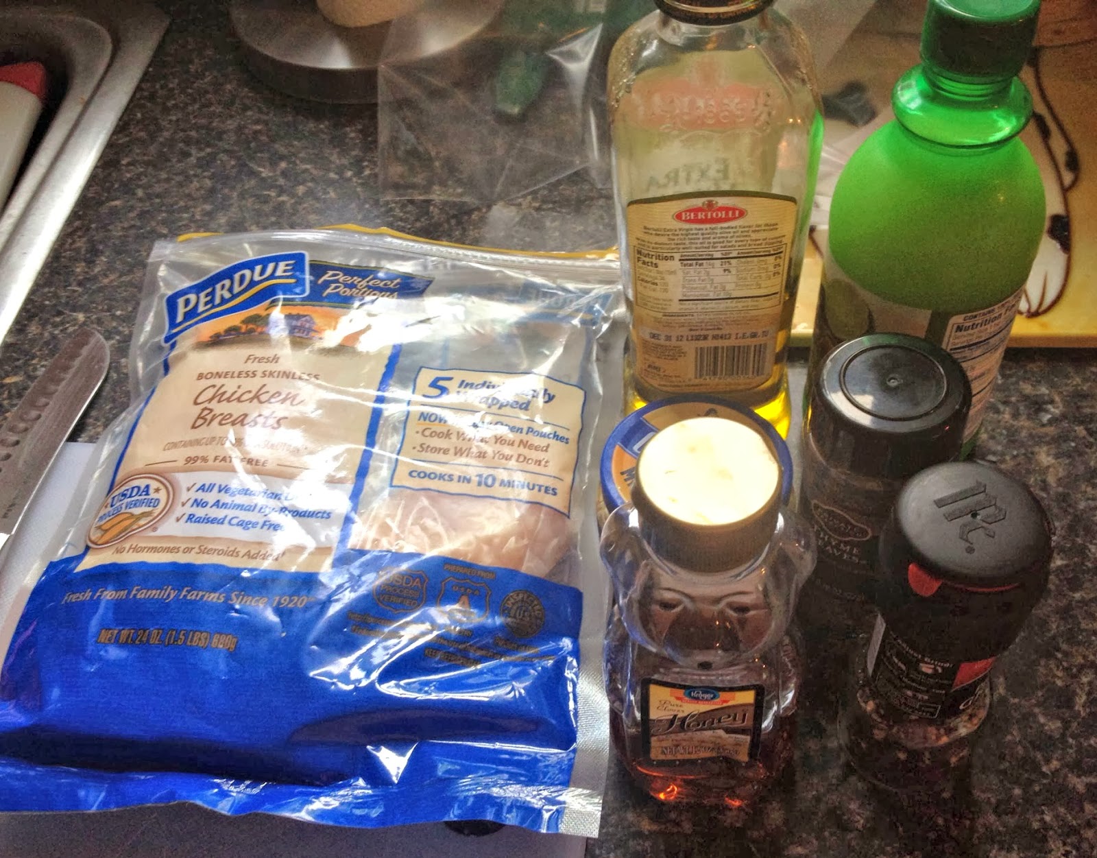 Pop it in a ziploc bag and you’re ready! I took three chicken breasts and cut them each into two pieces and plopped them into the bag. I put that in the fridge for the day.