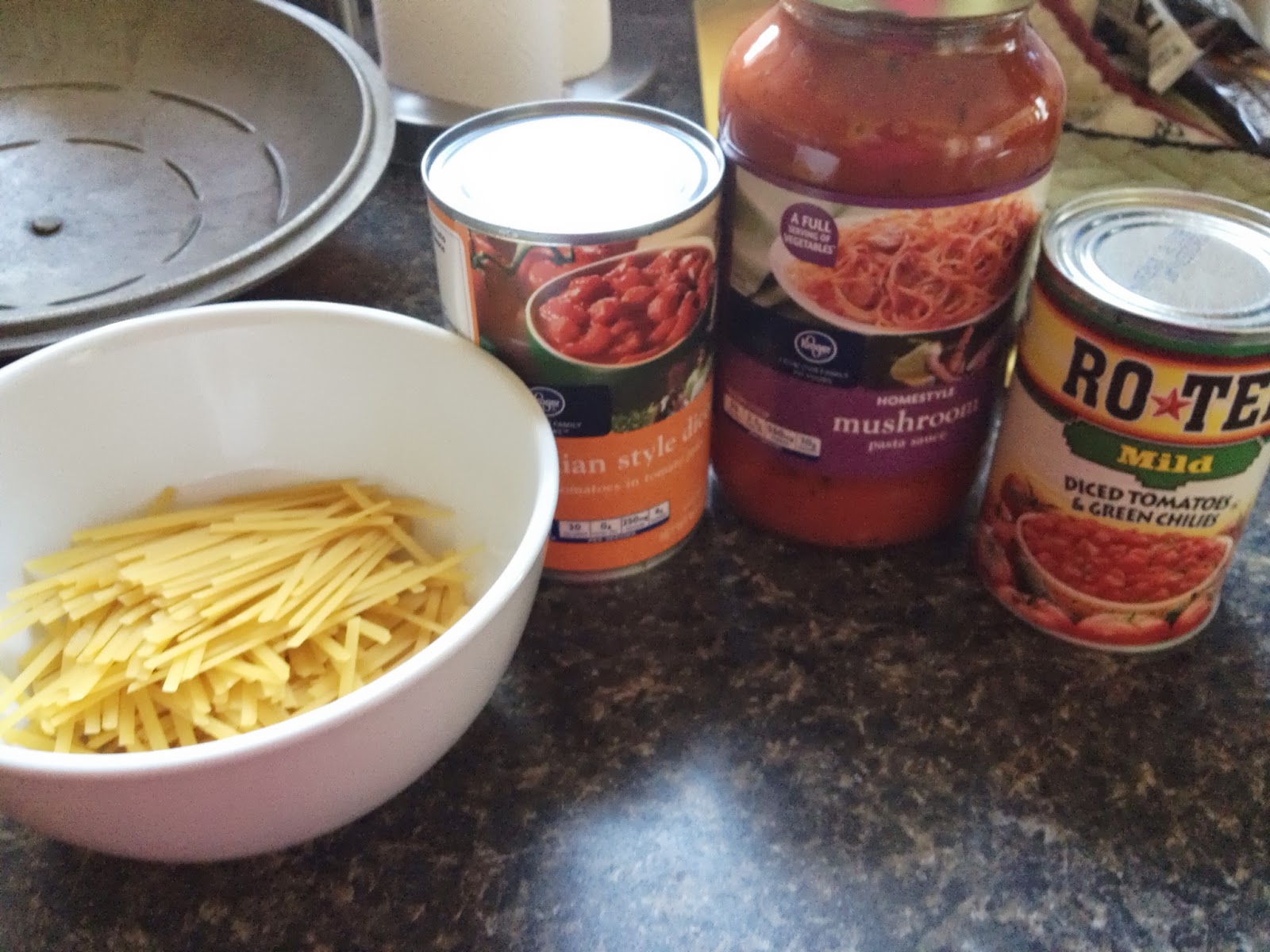 The other ingredients are so simple – water, tomatoes, spaghetti sauce, Italian seasoning, sugar and spaghetti (or linguine in my house).