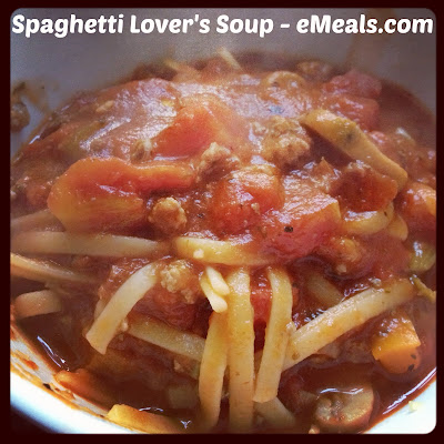 I found another great find on eMeals.com – Spaghetti Lover’s Soup! I think the thing I like is that the recipes remind me of Sandra Lee that does the Semi-Homemade – they’re easy recipes that take something familiar and then add some extras to it – to make it unique.