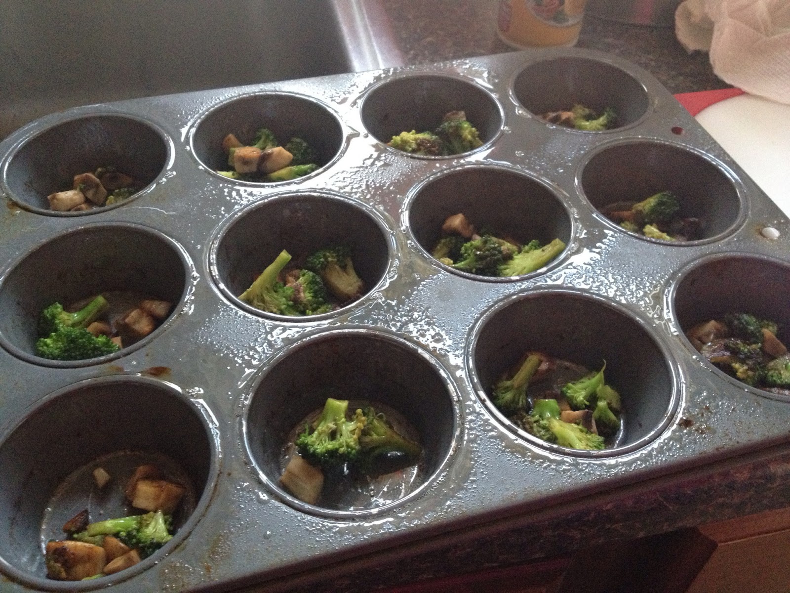 Then after spraying my muffin tin – I started the layering. I added a spoonful of veggies into the bottom of each muffin tray.
