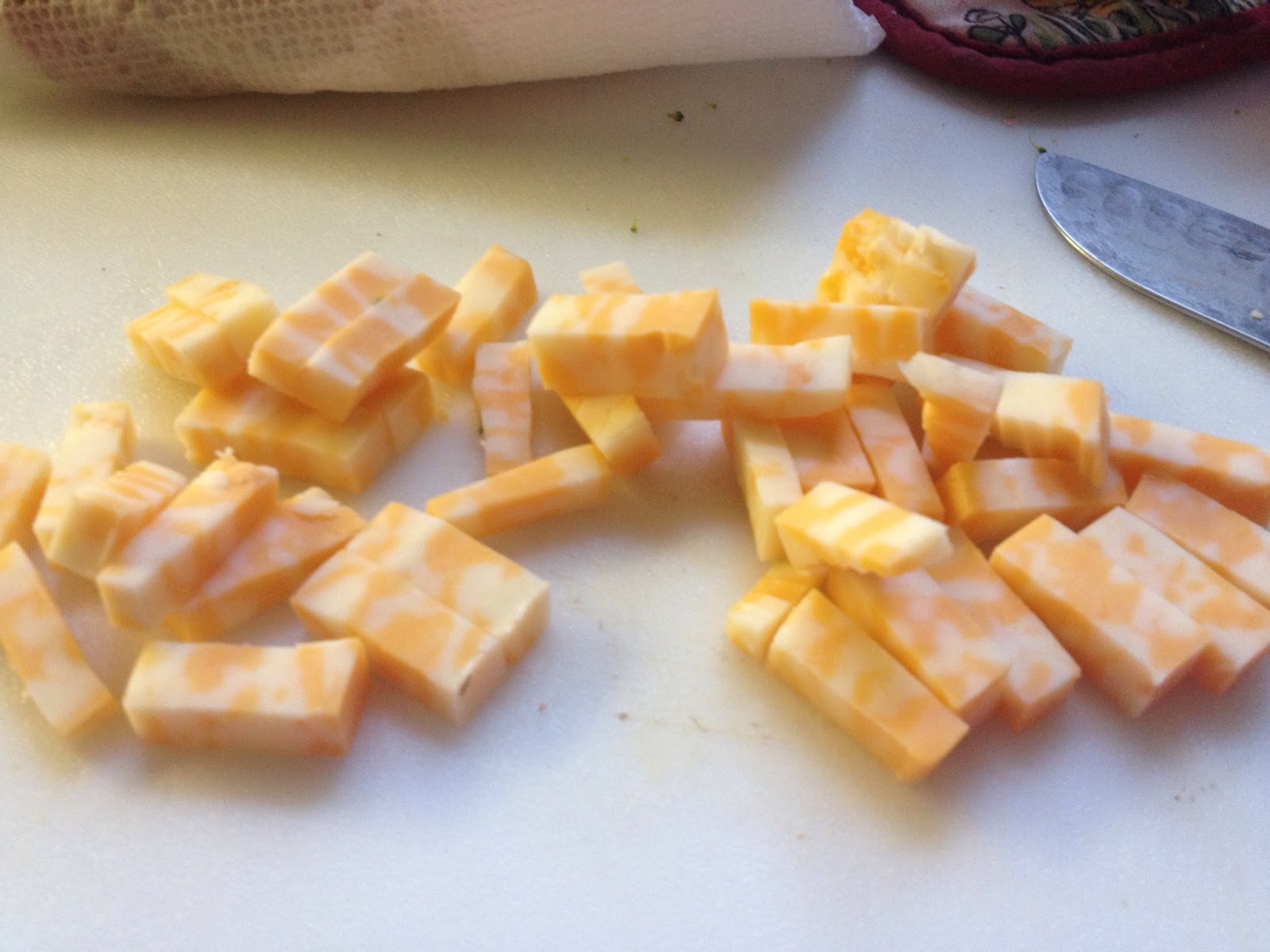 Next up was CHEESE! We all know how I love cheese – so I took a block of cojack and diced it into little rectangles. I then added a few of these to each muffin cup.