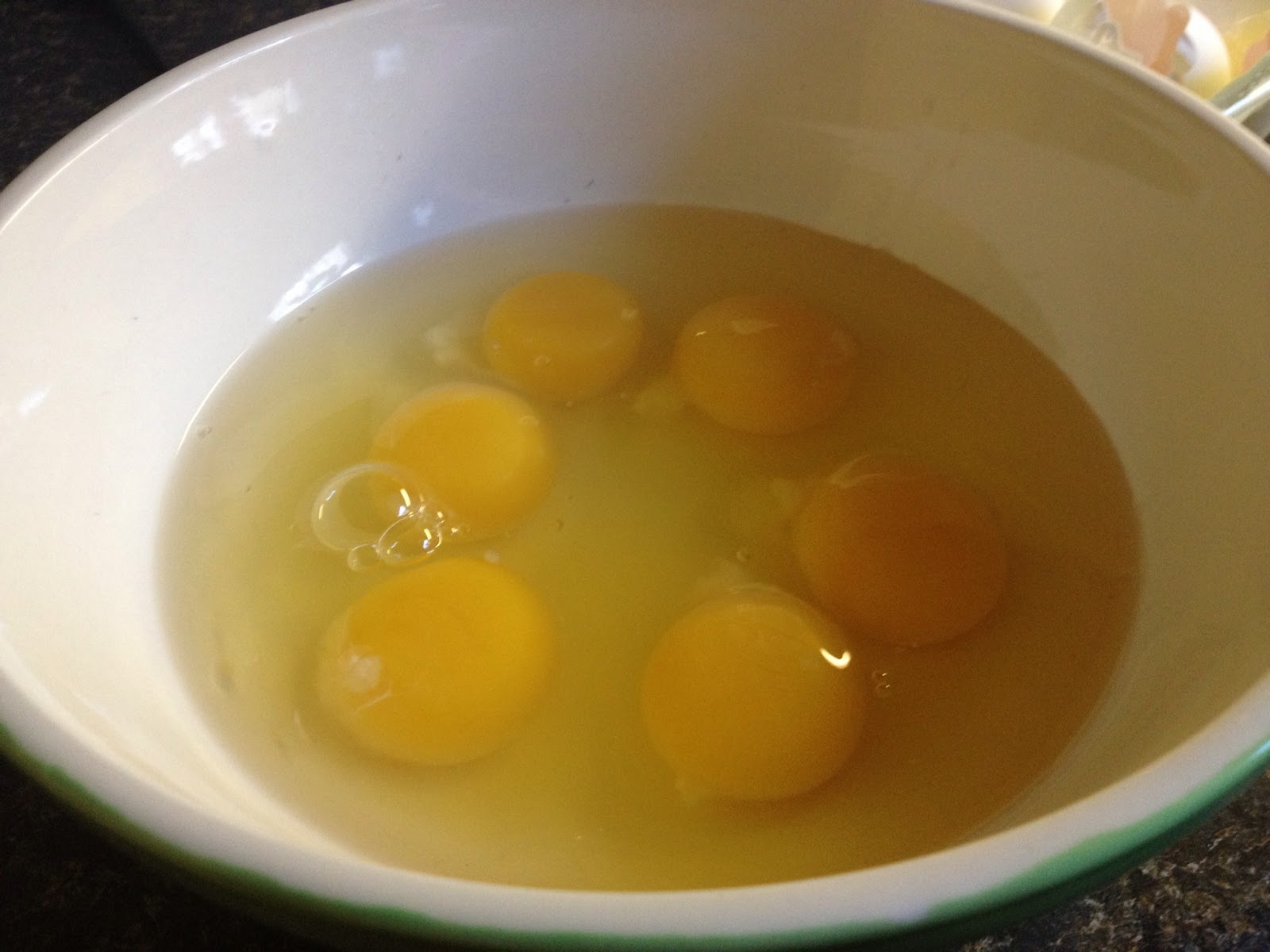 Next up – I beat six eggs – I did use the whole egg but you could use just whites, a mix of whole/whites or an egg substitute. As with the previous steps – I distributed throughout the cups. I went for having the cups about 2/3 full.