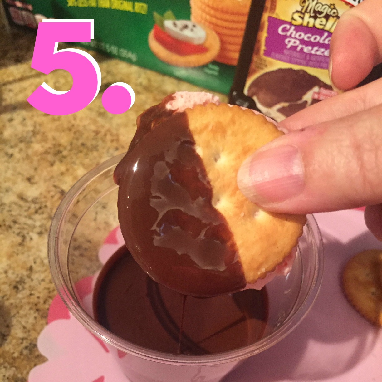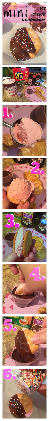 The ingredients for these mini ice cream sandwiches are so simple! Velvet ice cream, Ritz crackers, Magic Shell Chocolate Syrup and sprinkles.