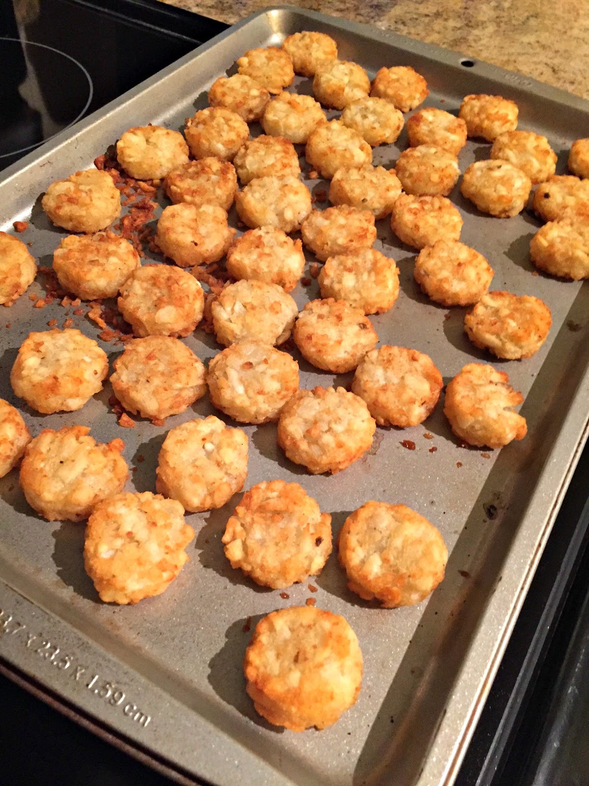 - 1/2 bag cooked Crispy Crowns (flat tater tots)