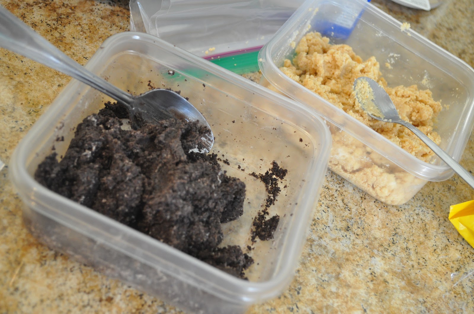 - Mix 1/2 oreos with 4 oz cream cheese (1/2 block) – this is now the “thick dirt”.