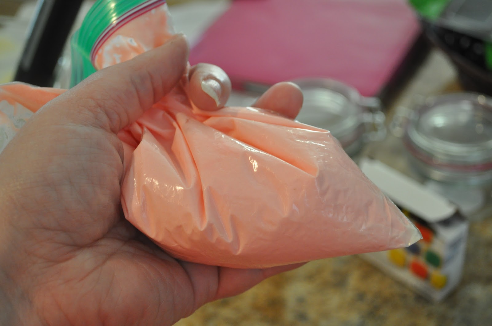 I spooned some of the vanilla cream into a ziploc and added a few drops of red food coloring. Then I sealed the bag and mushed it all together to color the cream. Then I put this in the fridge for a bit.