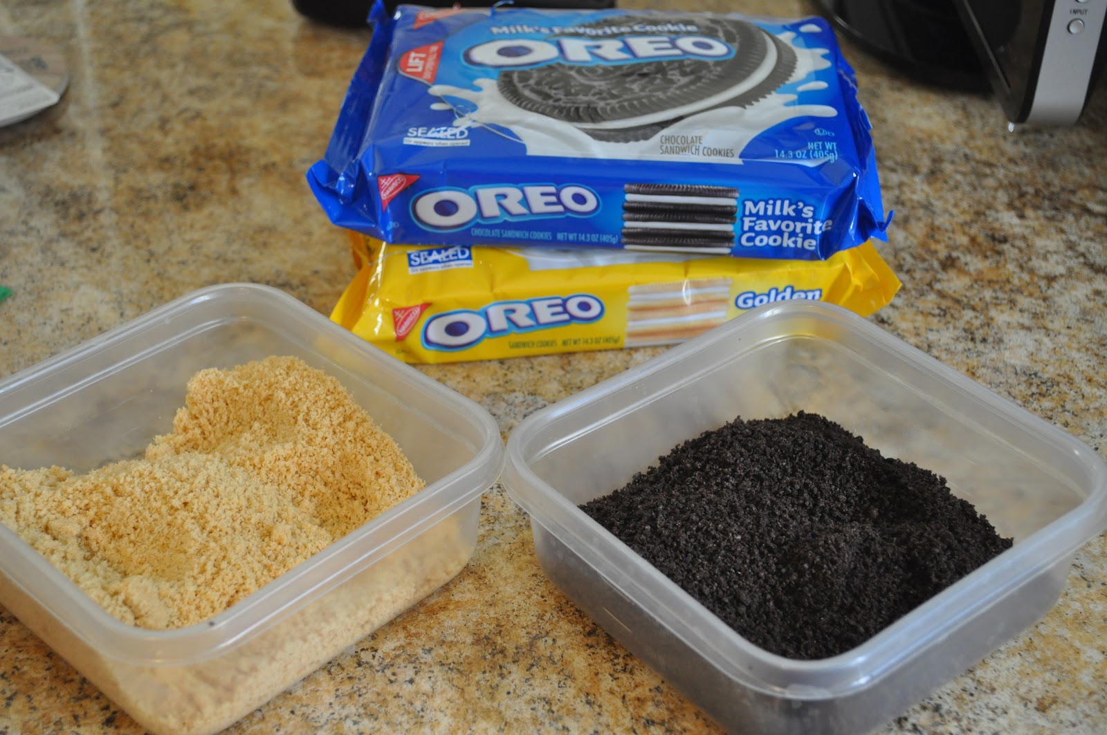 - Blend Oreos in food processor until pulverized. You can also use a rolling pin with the cookies in a gallon ziploc.