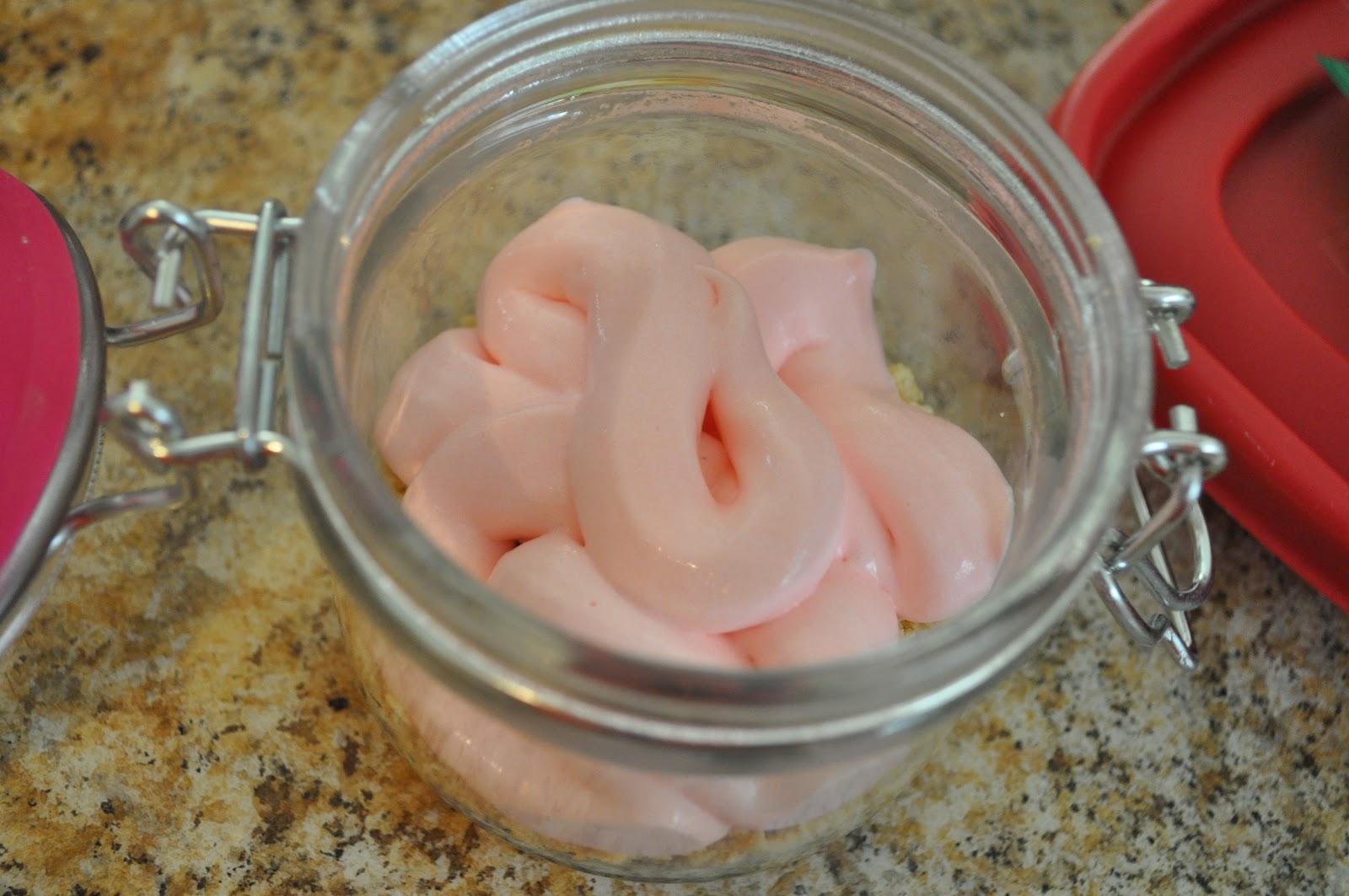 Then I added the pink vanilla cream mixture. I snipped the end off of the ziploc bag to make a DIY piping bag. And yes – when the bag was empty – I squirted the rest right in my mouth! It’s too tasty not to!
