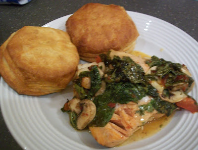 Last week I came across one I had been very eager to make: Baked Salmon with spinach, tomatoes and mushrooms. It was on the Kraft site – so there aren’t too many ingredients and it’s easy. I’m always looking for new ways to cook fish – it’s so good for you but I need some “stuff” to go with it.