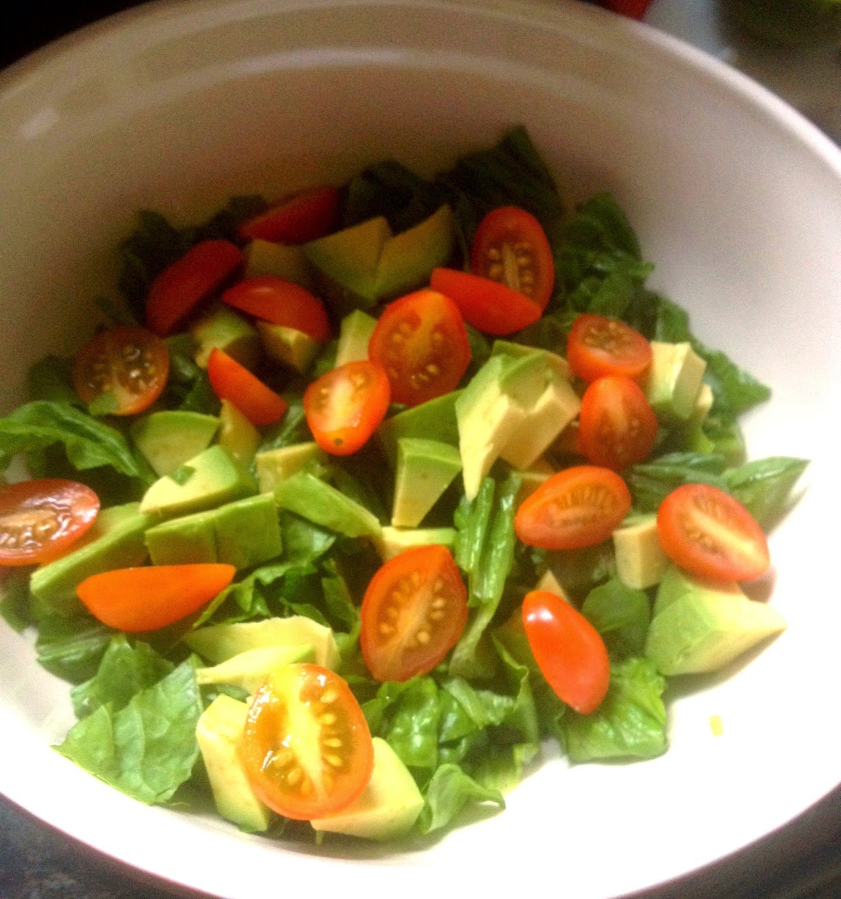 While the chicken was cooking – I chopped romaine lettuce, tomatoes and avocado and tossed that all together.