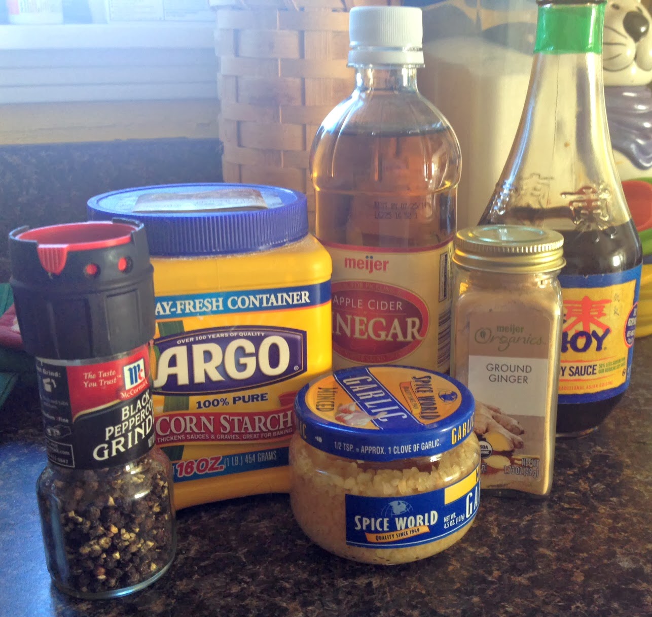 * Combine sugar, soy sauce, vinegar, ginger, garlic and pepper. Wisk and pour over chicken.
