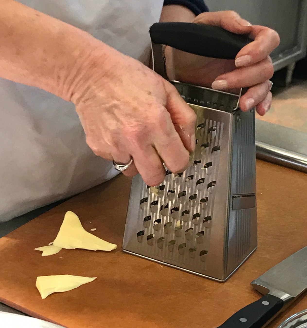 We did learn a few good tips – one of which was when you’re working with COLD butter – you can grate it so that it gets incorporated into the mix quicker. We did for the biscuits that we made (which were really good). And we don’t even think we got any finger in them!