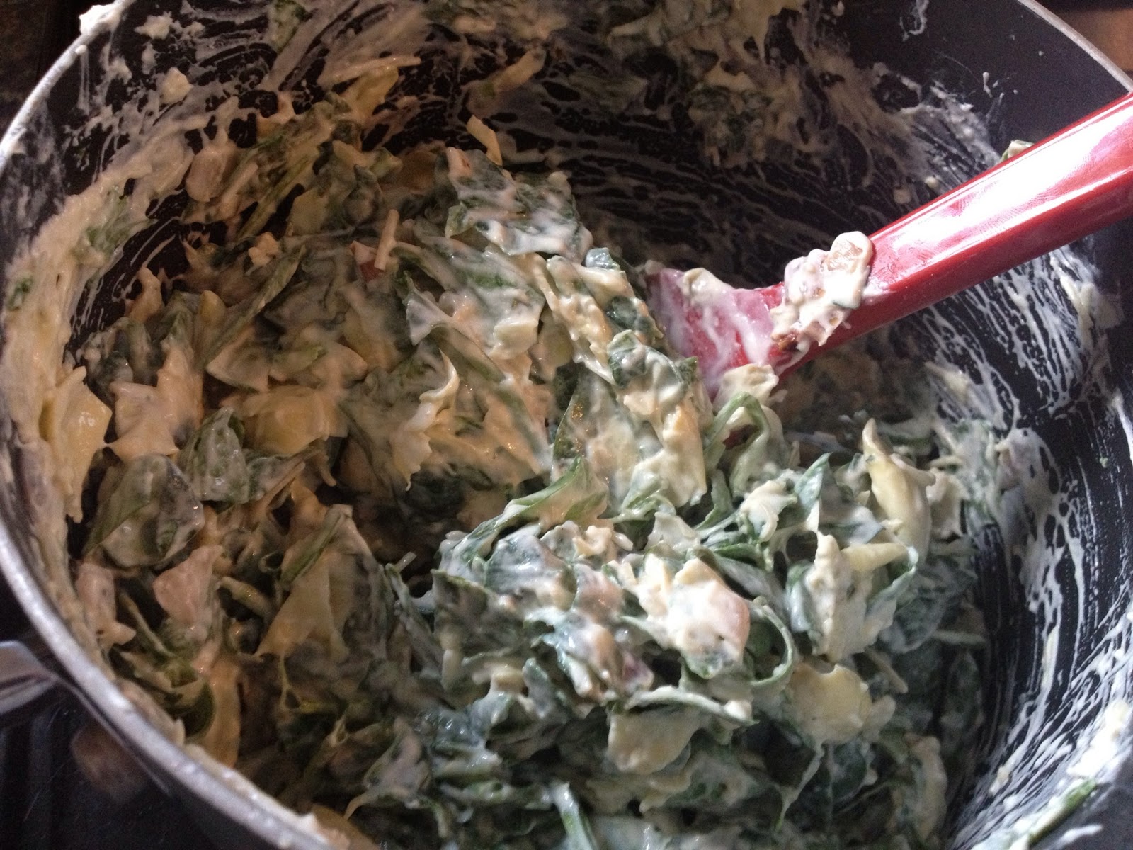 Earlier I placed chicken tenders in a baking dish and seasoned with salt & pepper – then spread the spinach mixture over the top of the chicken.